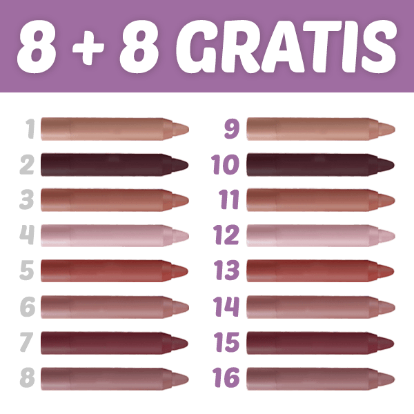 Iepakojumā: 8x Ilgnoturīgas, Matētas Lūpu krāsas + 8x Ilgnoturīgas, Matētas Lūpu krāsas BEZ MAKSAS.